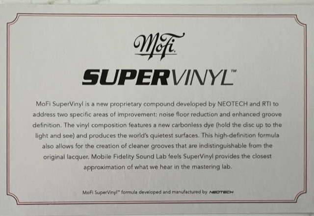 - What type of vinyl was used? Vinyl is a colourless material. Black is usually added but vinyl can come in any colour (slightly noisier) or with an impregnated picture (don’t bother – these are for display only). There all kinds of modern vinyl compounds that are thought to capture more information – sold with different names by different labels – but we will just call it “supervinyl.” Mobile Fidelity’s super audiophile product is a reissued album, (usually) cut “one step,” from the original masters (not necessarily AAA), at 45rpm, on supervinyl. And they sound really good. They also cost $100 more than regular re-issues.
