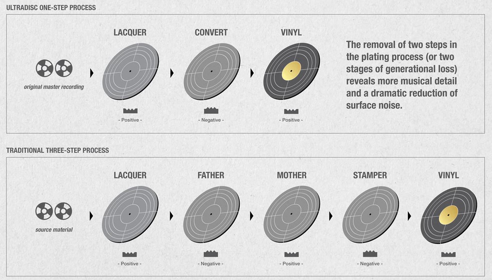 The “One Step” process involves making a series of lacquers (not just one paired set) that are essentially turned into the the stamper: they call this a “convert.” There is no father and no mother. It seems to me that each lacquer can only be used once to produce the convert. The convert-stamper can only be used once to produce – who knows 500 to 1000 records? Consequently you are pressing up the photocopy directly, and it should sound better. I have a few of these products (2 x 45rpm) and they do sound really good, despite the big box and need to flip every 7.5 minutes.